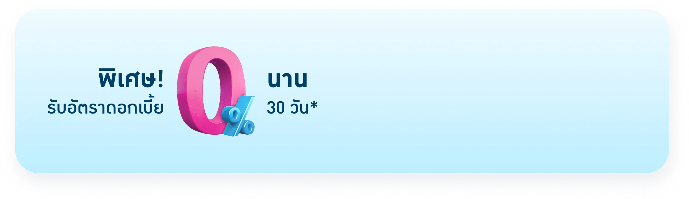 หมายเหตุ: *เพียงมียอดเบิกถอนเงินสดภายใน 30 วันหลังจากได้รับการอนุมัติ (เฉพาะยอดเบิกถอนภายในวันแรก สำหรับลูกค้าใหม่), หลังจบรายการส่งเสริมการขายอัตราดอกเบี้ยจะถูกปรับเป็นอัตราดอกเบี้ย 19.8% - 25% ต่อปี, กู้เท่าที่จำเป็นและชำระคืนไหว
