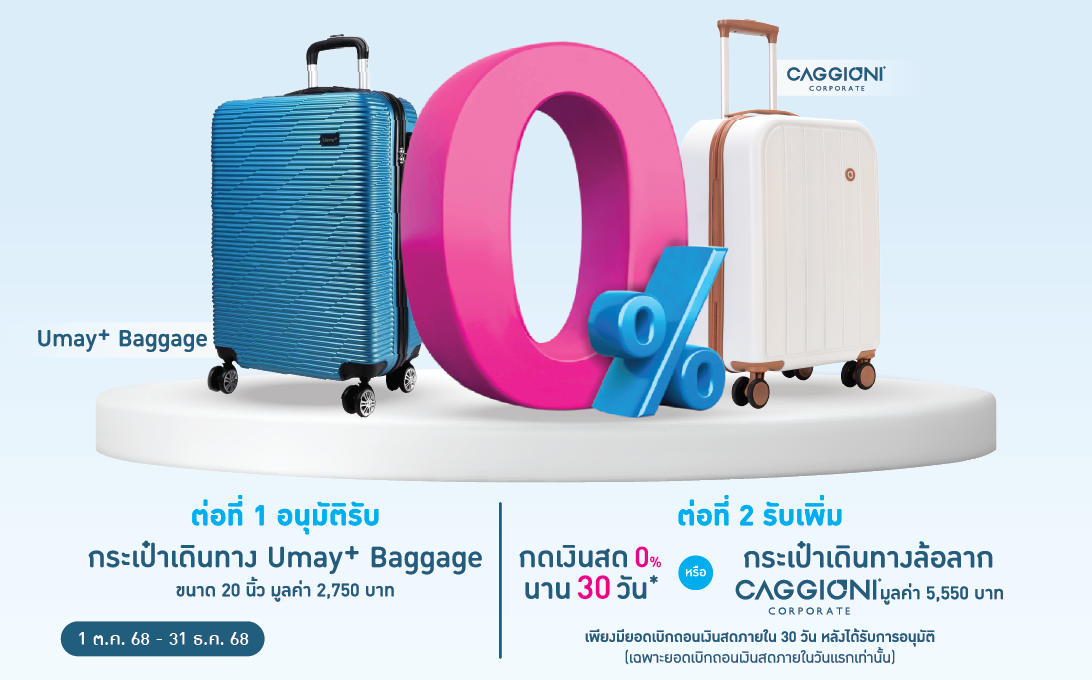 - สำหรับลูกค้าที่สมัครและได้รับการอนุมัติ ด้วยบริการยืนยันตัวตนรูปแบบดิจิทัล (NDID) รับกระเป๋า Umay+ Baggage มูลค่า 2,750 บาท สำหรับผู้มีรายได้ประจำตั้งแต่ 7,000 บาท ขึ้นไป