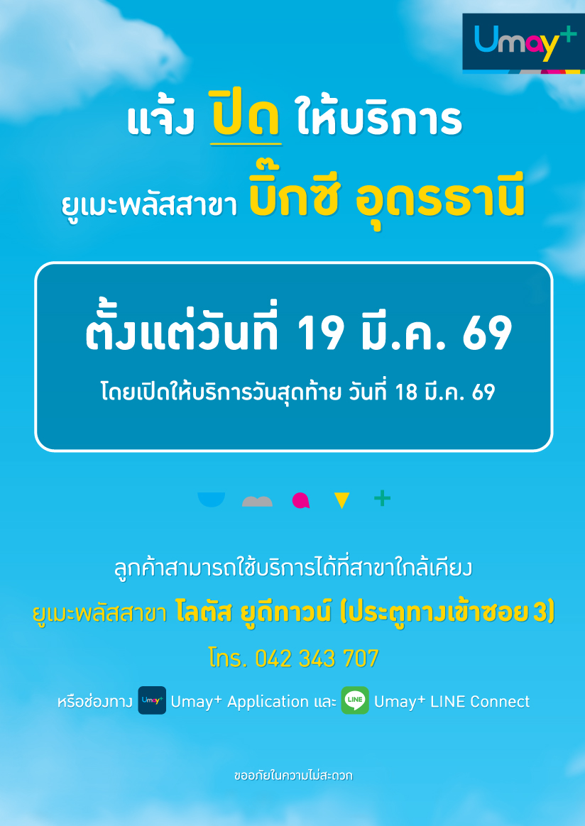 ประกาศจากยูเมะพลัสแจ้งปิดให้บริการสาขา บิ๊กซีอุดรธานี