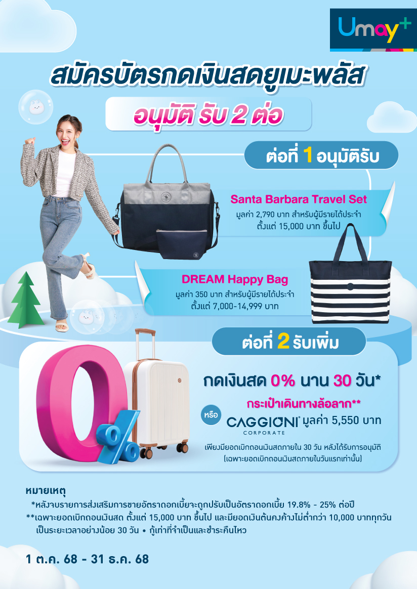 - กระเป๋าเดินทางล้อลาก มูลค่า 5,550 บาท เฉพาะยอดเบิกถอนเงินสดในวันแรกตั้งแต่ 15,000 บาท ขึ้นไป และมียอดเงินต้นคงค้างไม่ต่ำกว่า 10,000 บาทตลอดระยะเวลา 30 วัน