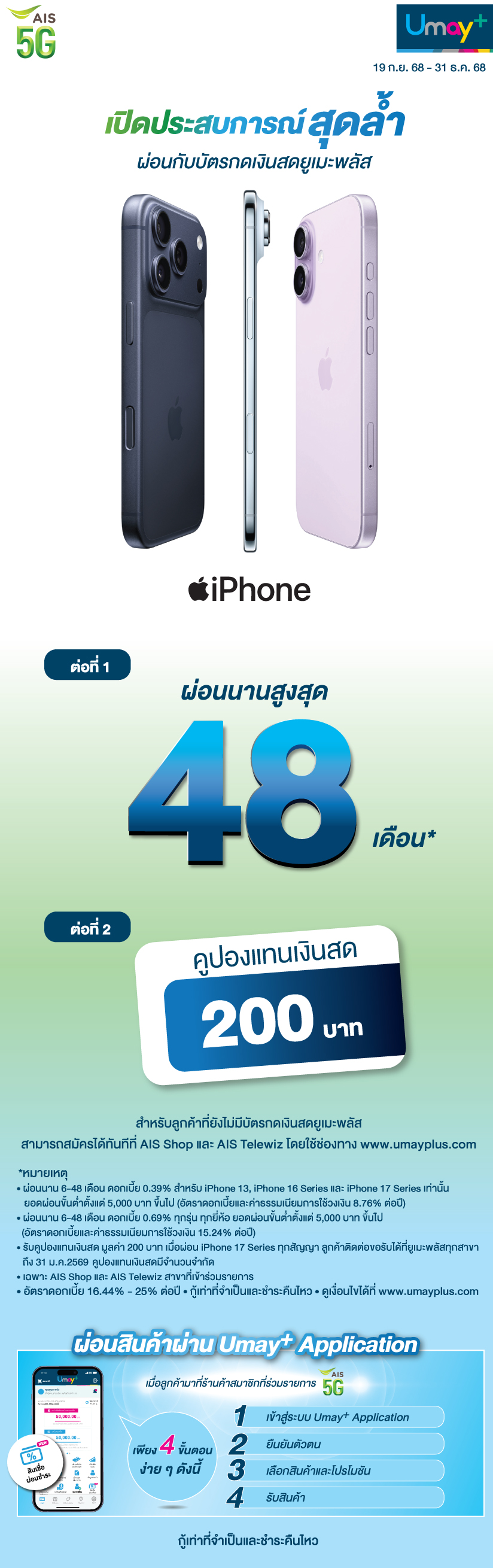 - กับโปรผ่อนดอกเบี้ย 0.39% ต่อเดือน นาน 6 - 48 เดือน สำหรับ iPhone 13, iPhone 16 Series และ iPhone 17 Series เท่านั้น ยอดผ่อนตั้งแต่ 5,000 บาท ขึ้นไป