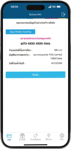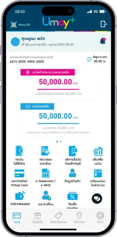 - บัญชีที่ใช้ในการโอนเงินต้องเป็นบัญชีของท่านเองเท่านั้น และต้องเป็น บัญชีเดียวกับที่ท่านทำการยื่นสำเนาหน้าบัญชีพร้อมกับการยื่นเอกสารประกอบการสมัครบัตรกดเงินสดยูเมะพลัส / บัตรกดเงินสดยูเมะพลัส พรีเมียร์ เท่านั้น